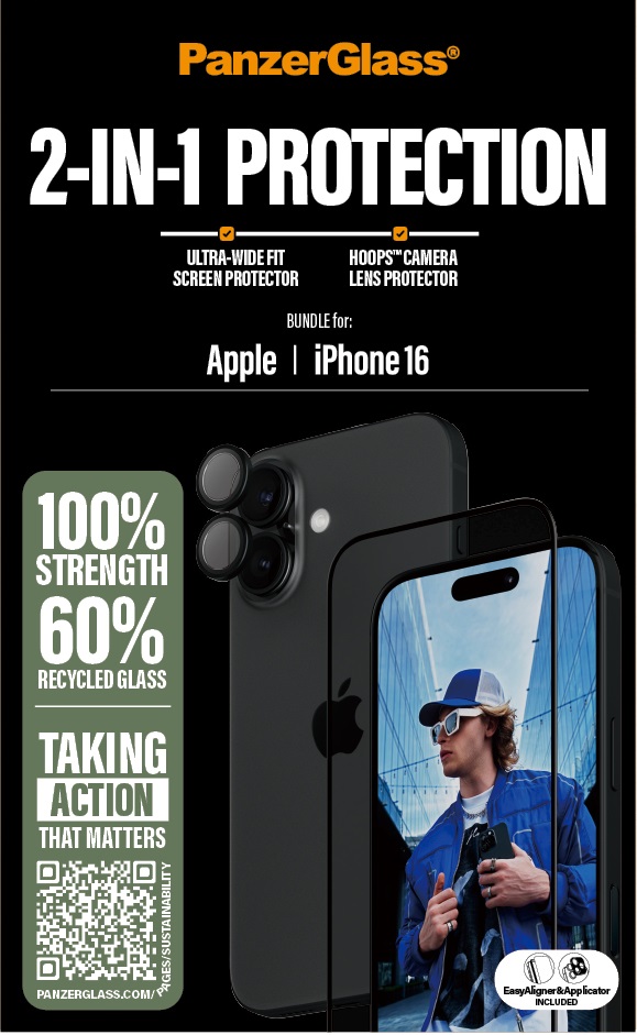 Ochranné sklo PanzerGlass™ pre iPhone 16 prichádza s revolučným zložením. Až zo 60 % je tvorené recyklovaným sklom, vďaka čomu je ekologickejšie ako kedykoľvek predtým. Zároveň si však stále zachováva nekompromisnú odolnosť. Pri výrobe je temperované v peci, nie chemicky, pri teplote 500 °C po dobu 5 hodín.