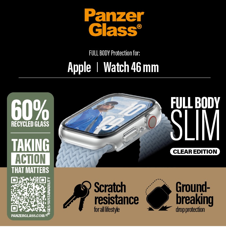 Ochranné sklo PanzerGlass™ pre Apple Watch prichádza s revolučným zložením. Až zo 60 % je tvorené recyklovaným sklom, vďaka čomu je ekologickejšie ako kedykoľvek predtým. Zároveň si však stále zachováva nekompromisnú odolnosť. Pri výrobe je temperované v peci, nie chemicky, pri teplote 500 °C po dobu 5 hodín.