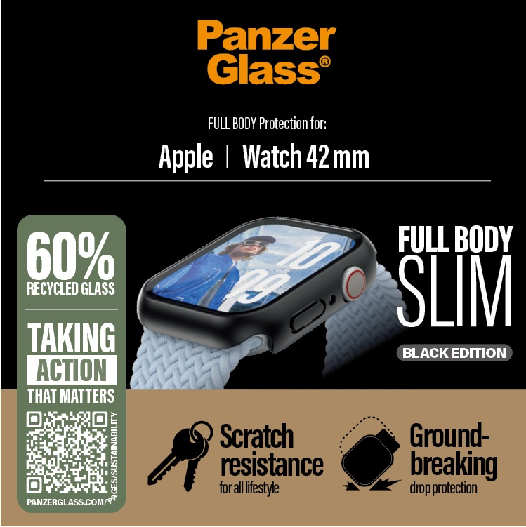 Ochranné sklo PanzerGlass™ pre Apple Watch prichádza s revolučným zložením. Až zo 60 % je tvorené recyklovaným sklom, vďaka čomu je ekologickejšie ako kedykoľvek predtým. Zároveň si však stále zachováva nekompromisnú odolnosť. Pri výrobe je temperované v peci, nie chemicky, pri teplote 500 °C po dobu 5 hodín.