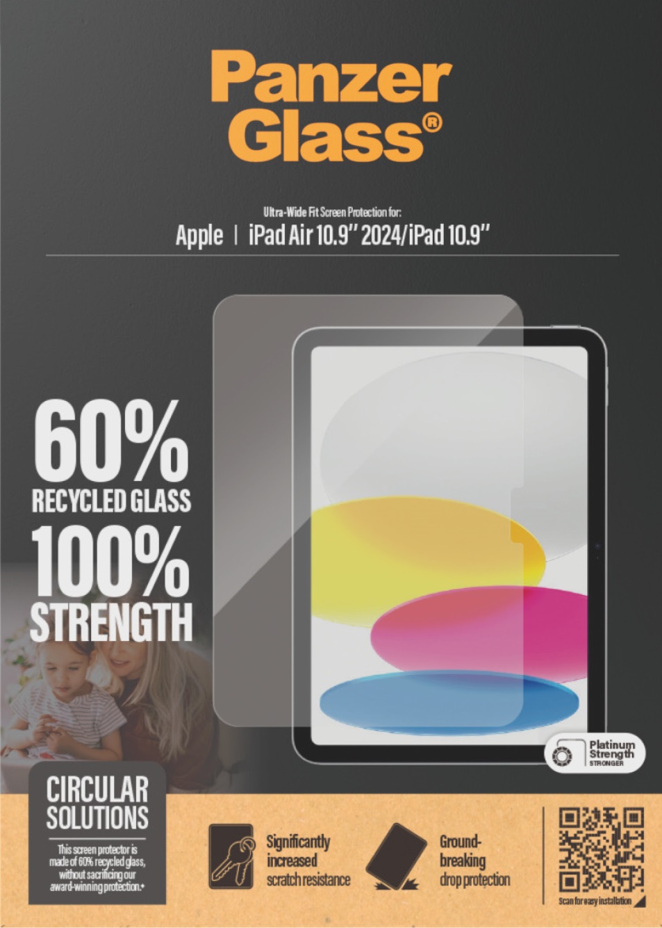 Ochranné sklo PanzerGlass™ pre iPad prichádza s revolučným zložením. Až zo 60 % je tvorené recyklovaným sklom, vďaka čomu je ekologickejšie ako kedykoľvek predtým. Zároveň si však stále zachováva nekompromisnú odolnosť. Pri výrobe je temperované v peci, nie chemicky, pri teplote 500 °C po dobu 5 hodín.