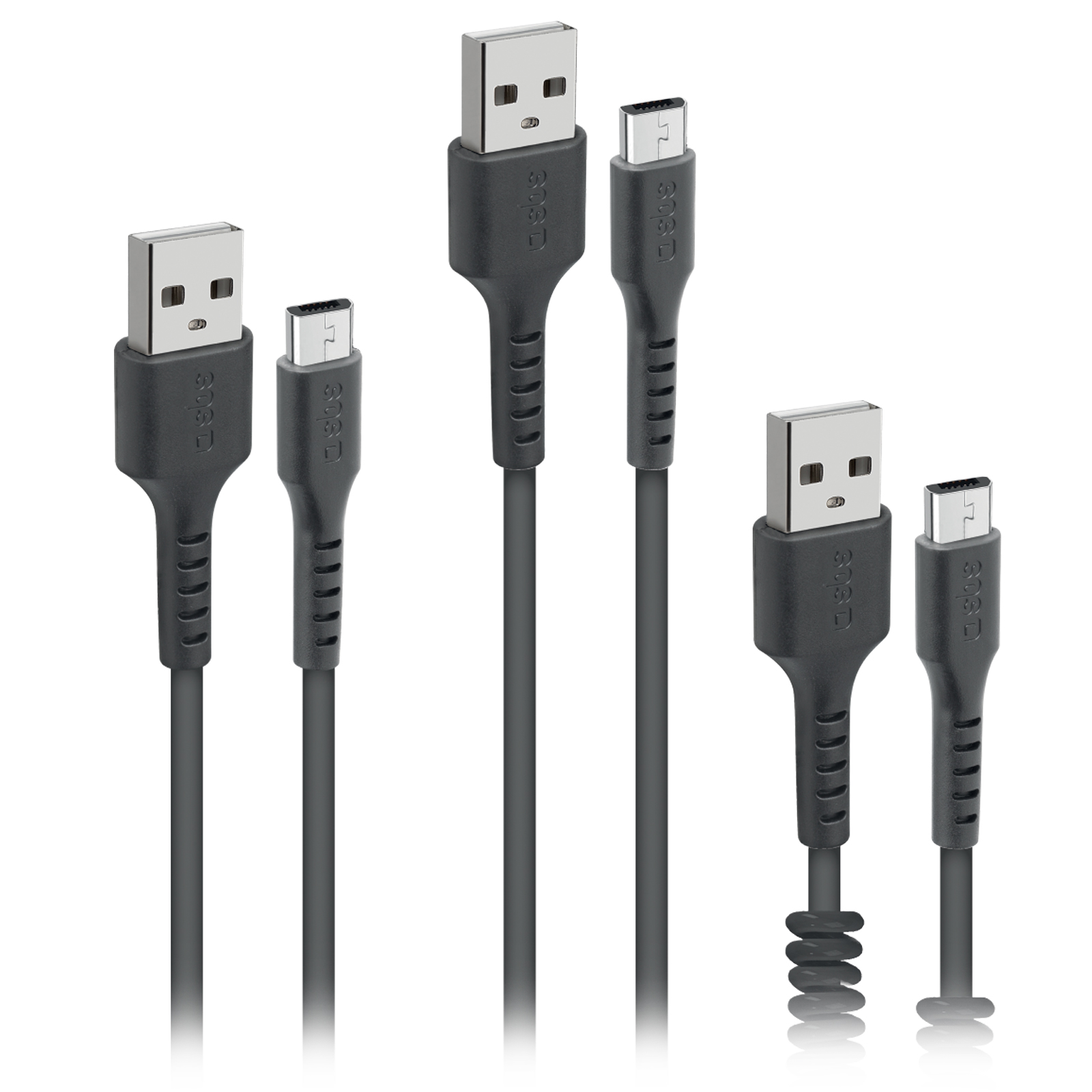 Sada káblov spoločnosti SBS. Obsahuje 3 káble rôznej dĺžky určené na pripojenie k zariadeniam s konektorom Micro-USB. Pripojte káble k zdroju napájania vybavenému portom USB a nabíjajte kompatibilné zariadenia, ako sú smartfóny alebo tablety. Pripojením zariadení k notebooku ich môžete súčasne nabíjať a prenášať hudbu, videá a obrazové súbory. V balení sa nachádza štandardný kábel s dĺžkou 1 m, mimoriadne dlhý kábel s dĺžkou 2 m a napokon špirálový kábel, ktorý sa predĺži až na 50 cm.