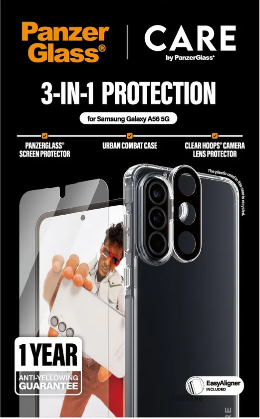 Kombinácia týchto špičkových produktov PanzerGlass™ zaistí 360-stupňovú ochranu vášho telefónu pred škrabancami od ostrých predmetov a rozbitím v dôsledku silných nárazov alebo pádov. Vďaka tomu predlžuje životnosť smartfónu, svoj Samsung Galaxy A56 môžete bez obáv brávať na všetky dobrodružstvá a nemusíte sa obávať, že sa len tak ľahko poškodí.