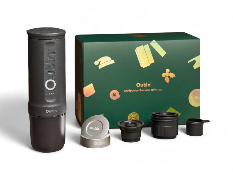 Vianočný set Outin Nano obsahuje prenosný espresso kávovar, navrhnutý pre milovníkov kávy, ktorí požadujú kvalitu aj na cestách. Patrí medzi najľahšie a najkompaktnejšie kávovary na trhu, váži len 700 g a má rozmery 230 × 69,8 mm. Napriek malým rozmerom dosahuje tlak až 20 barov, čo umožňuje extrahovať espresso s s výraznou a plnou chuťou porovnateľnou s profesionálnymi kávovarmi. Kávovar sa zohreje na extrakčnú teplotu 92 °C približne za 180 – 200 sekúnd pri použití studenej vody.