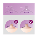 Kryty na bradavky sú k dispozícii v dvoch veľkostiach, aby sa lepšie prispôsobili prsníku. Malé kryty sa hodia na bradavky s priemerom od 12 mm a stredné do 21 mm. Ak chcete zistiť svoju veľkosť, urobte si pohodlie a dajte si na bradavku jeden z dierovaných krúžkov. Otáčajte kryt v smere hodinových ručičiek a zasuňte bradavku do výčnelku. Potom roztiahnite spodnú časť krytu okolo dvorca. Ak je medzi bradavkou a silikónom priestor 2 mm, je to správna veľkosť.