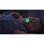 Cumlík je vybavený krytom, ktorý v tme jemne svieti. To umožňuje rodičom ľahko nájsť cumlík aj v úplnej tme bez potreby rozsvecovať svetlá. Tento praktický detail zabezpečuje nerušený nočný režim dieťaťa a uľahčuje upokojenie aj pri slabom osvetlení.
