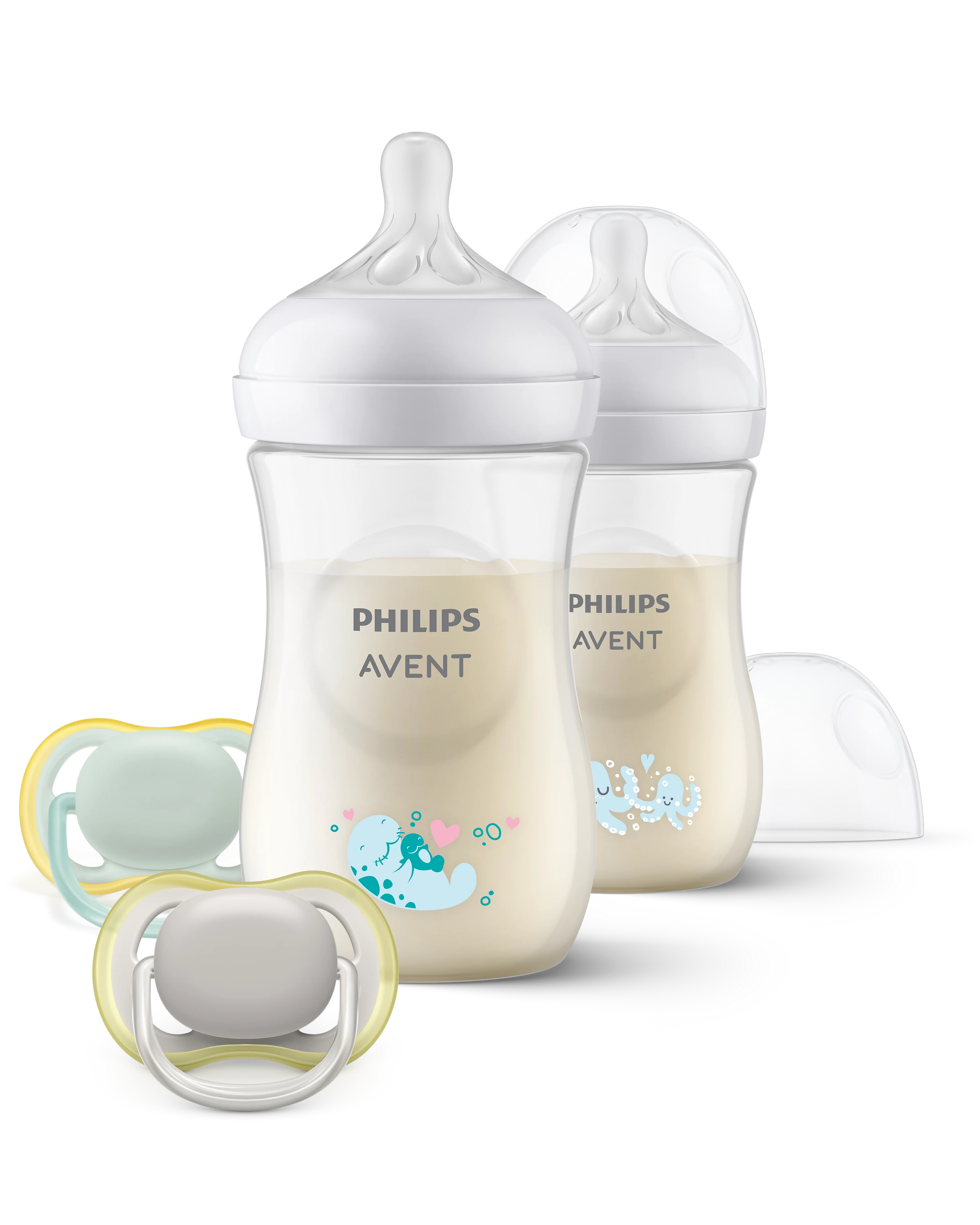 Súčasťou súpravy je aj cumlík Philips Avent ultra air, ktorý je navrhnutý pre citlivú pokožku dieťaťa. Má extra veľké otvory, ktoré umožňujú pokožke dýchať a udržiavajú ju suchú. Jeho ľahká vrchná časť zabezpečuje maximálny prietok vzduchu. Všetky produkty v súprave sú kompatibilné s ostatnými výrobkami Philips Avent a vyrobené z materiálov bez obsahu BPA*, čo zaručuje bezpečnosť pri každodennom používaní.