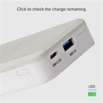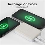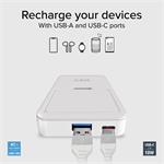 Na používanie tejto powerbanky nie je potrebné, aby váš telefón podporoval bezdrôtové nabíjanie. Stačí pripojiť vlastný kábel do jedného z dvoch dostupných portov – USB-A alebo USB-C – a zariadenie sa bude nabíjať výkonom 10 W. Povrch powerbanky zároveň poslúži ako praktický stojan. Vďaka technológii Intelligent Charge je nabíjanie nielen rýchle, ale aj maximálne bezpečné. Port USB-C slúži aj na nabíjanie samotnej powerbanky pomocou priloženého USB-A/USB-C kábla. Oba USB porty je možné využiť súčasne, takže môžete naraz nabíjať napríklad smartfón a tablet, reproduktor, čítačku kníh alebo inteligentné hodinky.