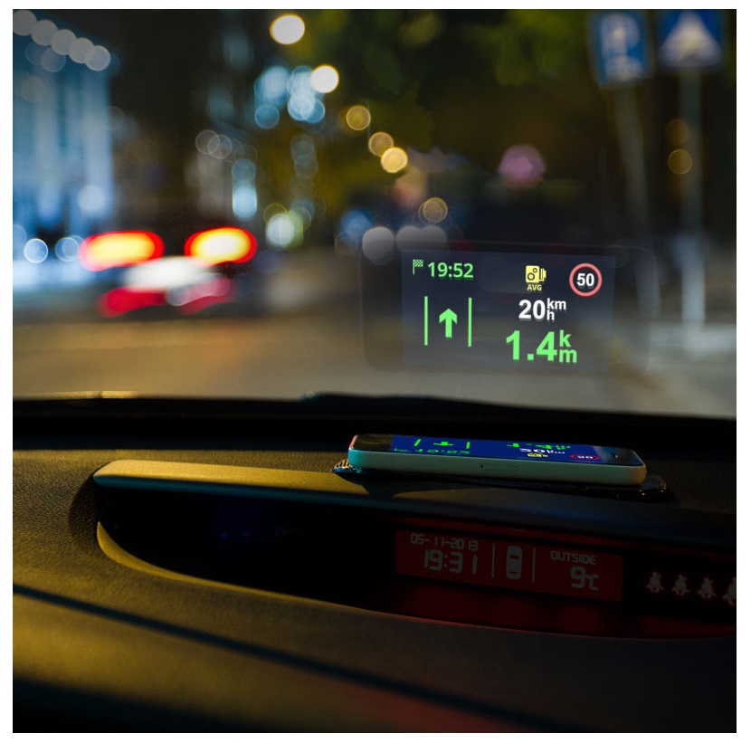 HeadUpDisplay-Řiďte v noci bezpečnější díky Sygic GPS navigací. Head-up Display promítá speciálně optimalizované navigační instrukce přímo na čelní sklo auta, abyste během řízení nemuseli spouštět oči z vozovky.